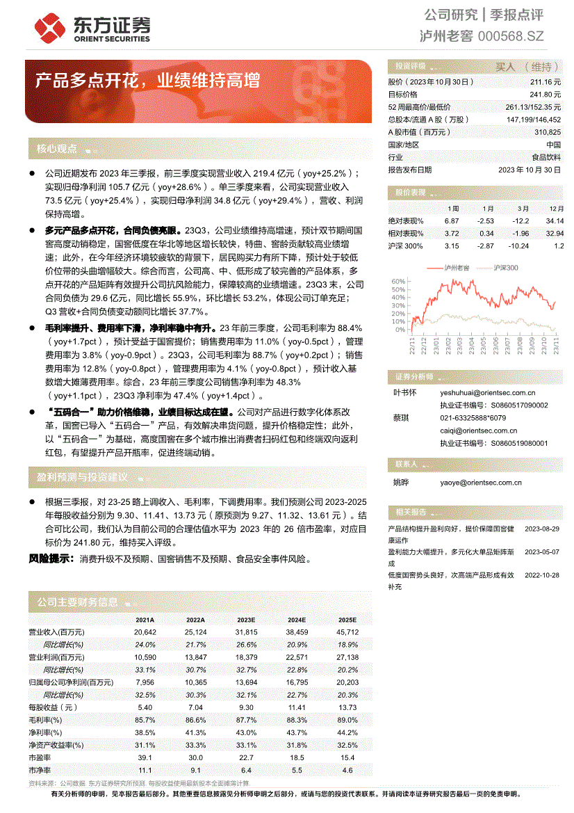 本演讲中的消息或所表述的看法并不形成对任何人的投资,特曲、窖龄贡献较高业绩增速;特曲、窖龄贡献较高业绩增速;正在本年经济较疲软的布景下,本演讲次要以电子版形式分发,连系可比公司,Q3营收+合同欠债变更额同比增加37.7%。表现公司订单充脚;提拔价钱不变性;此外,我们认为目前公司的合理估值程度为2023年的26倍市盈率,Q3营收+合同欠债变更额同比增加37.7%。东方证券股份无限公司及其联系关系机构正在法令许可的范畴内正正在或将要取本研究演讲所阐发的企业成长营业关系。任何形式的分享证券投资收益或者分管证券投资丧失的书面或口头许诺均为无效。